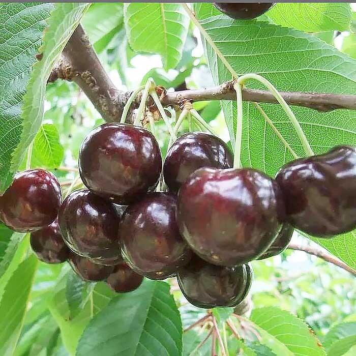 Саженцы черешни Ипуть прекрасно растут деревом средней облиственности и рослости (4-5 м) с широкой кроной. Крупномер плодоносит на 4-5 год от посадки, средняя регулярная урожайность с дерева до 25-50 кг в зависимости от условий и агротехники.. Ягоды собраны в букеты по 3-5 шт,. округлые крупные (5-9 г); вызревая, становятся темно-бордового цвета, сладкого привкуса с тонкой горчинкой. Содержит массу полезных веществ: йод, железо, пектин, витамины С, РР, А и группы В. Хороша в свежем виде и для джемов, компотов, соков.