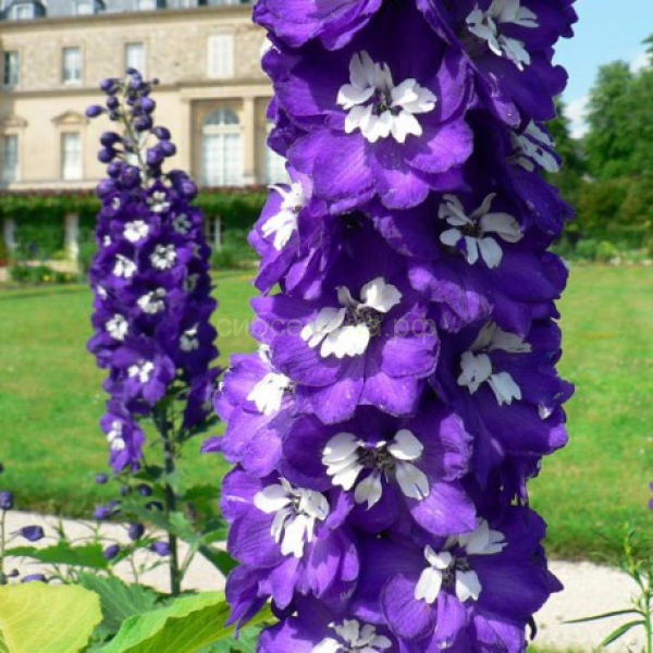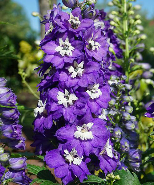 Дельфиниум высокий "Мэджик Фонтэйнс Дарк Блю Вайт Би" - это волшебное растение, которое поразит вас своей красотой и изяществом. Его стебель достигает высоты от 90 до 120 см, создавая великолепный вертикальный акцент в вашем саду. Цветки этого сорта имеют уникальную окраску - глубокий синий с белыми полосками, что придает им особую привлекательность.