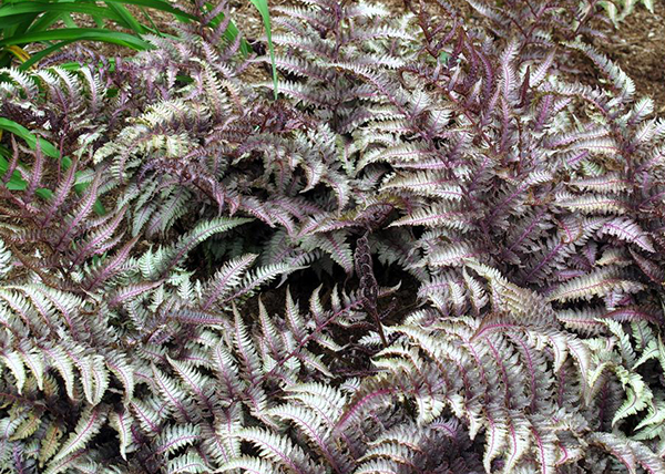 Саженцы Кочедыжника ниппонского Бургунди Лэйс (Athyrium niponicum Burgundy Lace) приобрели большую популярность за очень декоративную листву, имеющую металлический блеск и красно-багряные оттенки стебля. Кочедыжник ― это папоротник, сорт Бургунди Лэйс меняет свою окраску постепенно. Сначала появляются молодые красно-бордовые побеги, затем цвет листвы приобретает светло-розовый оттенок, а после она становится светло-серебристой с бордовой центральной частью. Сорт растет очень быстро при создании ему комфортных условий. Как и все папоротники тенелюбив, но немного солнца для проявления окраски получать все же должен. В притененных цветниках отлично смотрится с разными видами хост.