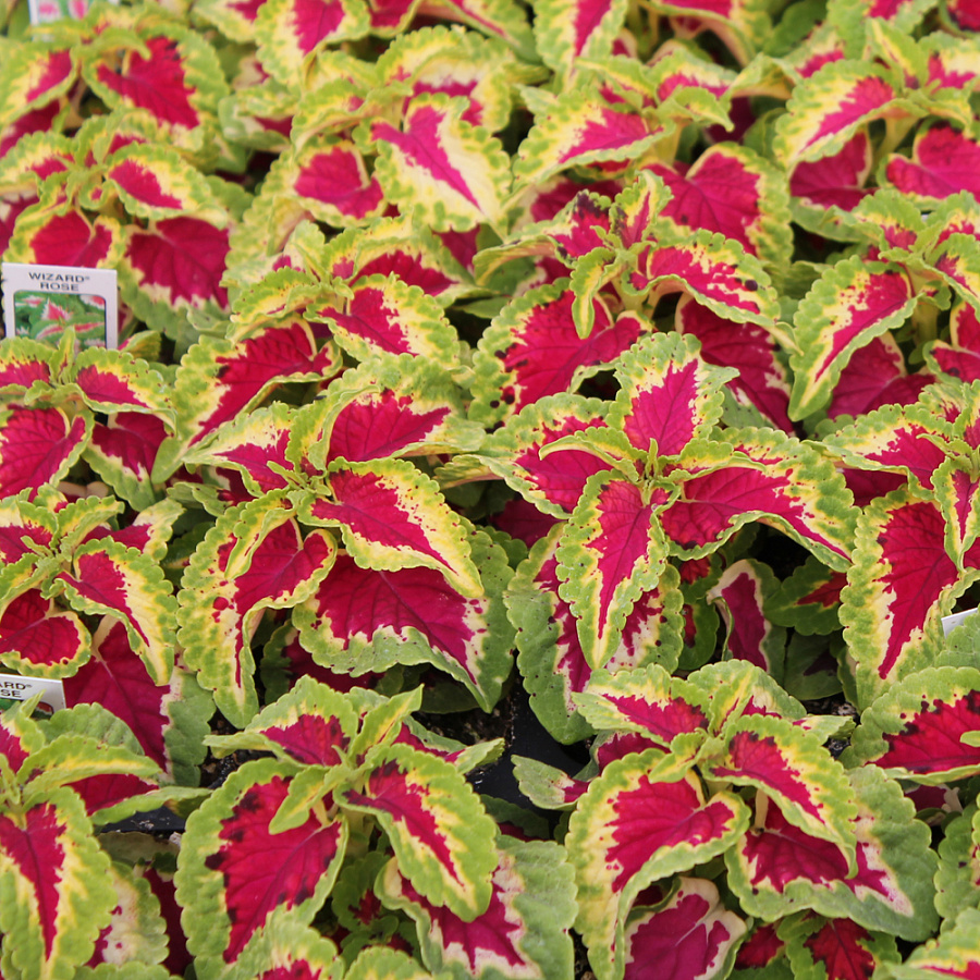 Семена колеуса Визард Роуз (Coleus, Vizard Rouz) заказывают любители эффектных однолетних культур. Высота взрослого растения не превышает 35 сантиметров, расцветка листьев салатово-розовая, текстура — бархатная, приятная на ощупь. При взгляде на кустик, создается впечатление, что он усыпан яркими сердечками. Колеус неприхотливый, для правильного развития и роста ему необходим солнечный свет и периодический полив. Используется для формирования клумб вдоль бордюров и сложных цветочных композициях. Приживается в горшках и кашпо, украшая дом. Хорошо отзывается на редкие подкормки.