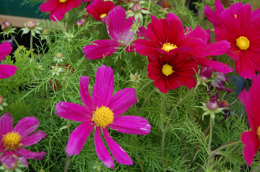 Космея Соната Кармин - это великолепное растение с изысканными вишневыми цветками, которые радуют глаз своей красотой в течение нескольких месяцев в году. Ее стебли прочные и устойчивые, достигают высоты до 60 см, что делает этот сорт идеальным для групповых посадок. Листья имеют интересную форму и создают уникальный вид растения.