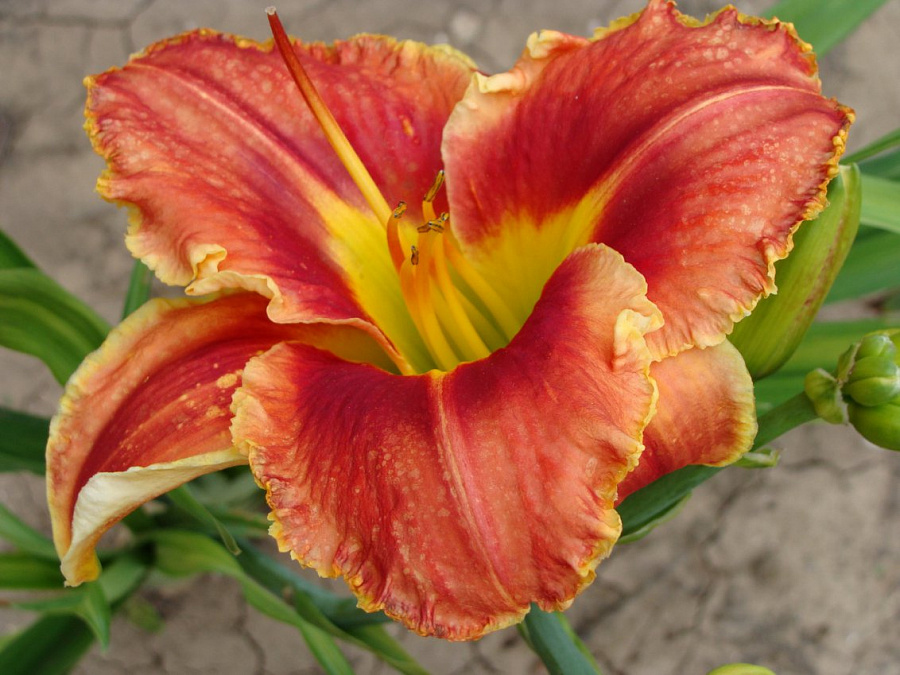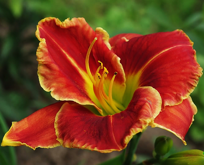 Окраска цветка : Ярко-красная с зелёным горлом и тонкой гофрированной золотистой каймой