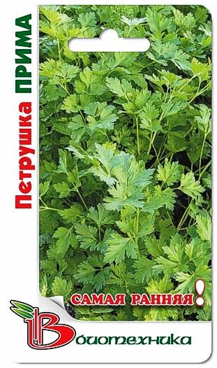 Семена петрушки "Прима" (Prima) быстро прорастают и позволяют собирать большой урожай вкусной и полезной зелени, в которой содержится много витамина С и каротина. Сорт подходит для выращивания в открытом и защищенном грунте. Выращивать можно рассадным способом или прямым посевом в грунт. Также может расти в зимнее время года на подоконниках. Лист темно-зеленого цвета, сильно рассеченный, доли гладкие, блестящие, на длинном черешке. Главное достоинства сорта – способность быстро отрастать после срезки (спустя 25-28 дней). Используют зелень в свежем или сушенном виде.