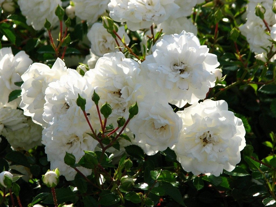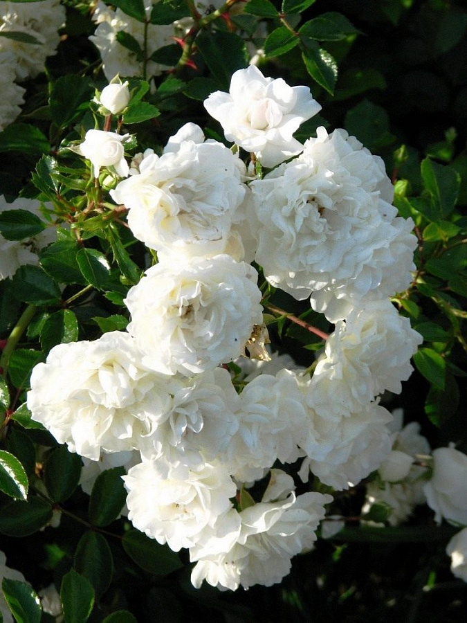 Саженцы розы почвопокровной Sea Foam идеально подходят для невысокой живой изгороди, использования как почвопокровного растения или создания каскада на склоне. Культура хорошо растет в полутени и на не очень богатых почвах. Высота куста 60-100 см, а ширина – 100 см. Цветы появляются на колючих, длинных, поникающих побегах в больших соцветиях. Бутоны небольшие, диаметром 5-6 см, бело-кремовые с небольшой розовинкой. Цветет роза почвопокровная Sea Foam с конца мая и до осенних заморозков.