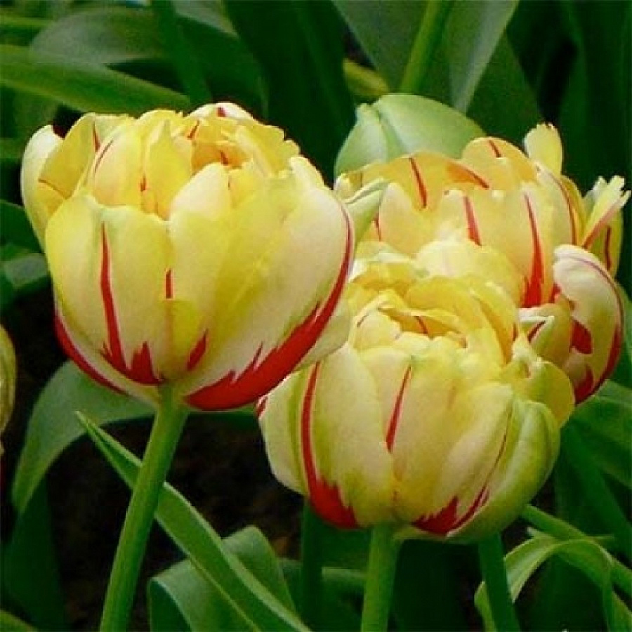 Тюльпан махровый поздний юник гламур - это великолепное растение с лимонно-желтыми цветками, украшенными малиново-красными полосами. Его стебель достигает высоты 50-60 см, что делает его идеальным для групповых и одиночных посадок. Листья тюльпана имеют травянистую форму, создавая элегантный вид в саду.